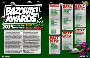 This issue also serves as the program guide for the Bazowie! Awards, presented by Zinetastic (us!), and lists all the Bazowie Awards nominees.