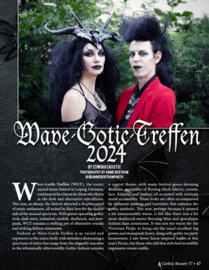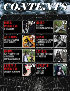 Features in this issue include Restyle gothic clothing modeled by Ann Siren, Alpravena and Blue Astrid, Cat Lynn System and Collin DIY alternative wedding accessories, Wave Gotik Treffen music festival photographed by Annie Bertram, Avelina de Moray housewares, music, jewelry designs and more. Plus book reviews and music reviews, with an exclusive feature interview with Volodina of Stridulum, and spotlights on Mothica, Johnnie Guilbert, Lyrica, and Malcriada.